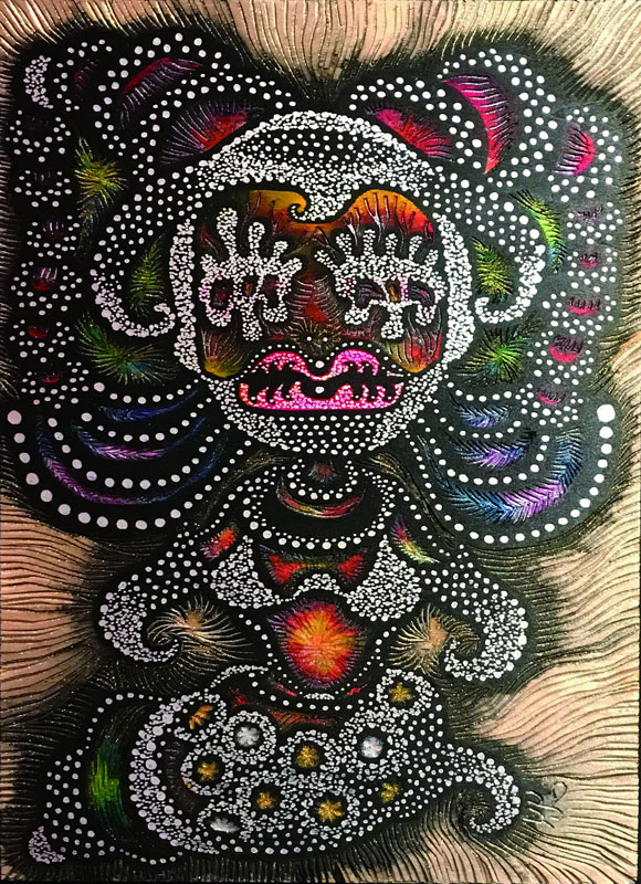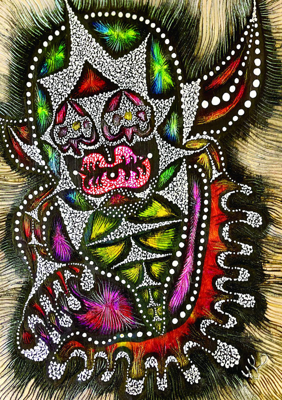 創作過程不打草稿,直接使用油性麥克筆和墨汁、日本畫顏料上色,並在木板上雕刻,一氣呵成。